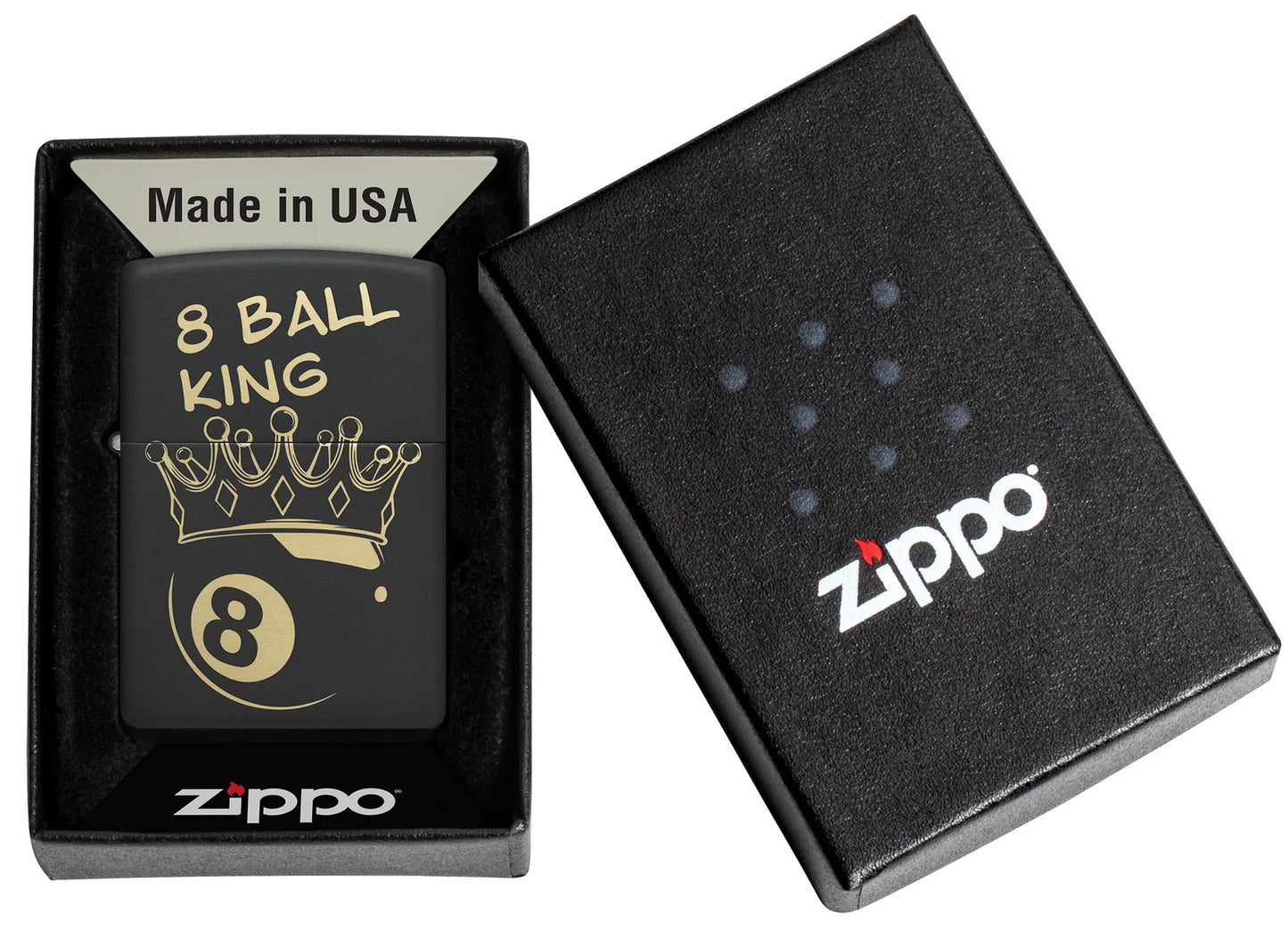 Perfect for any pool hall champion, this classic Black Matte lighter features a Laser Engrave design of an Eight ball adorned with a crown. Comes packaged in a gift box. For optimal performance fill with Zippo lighter fuel.