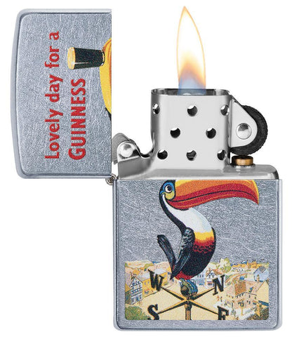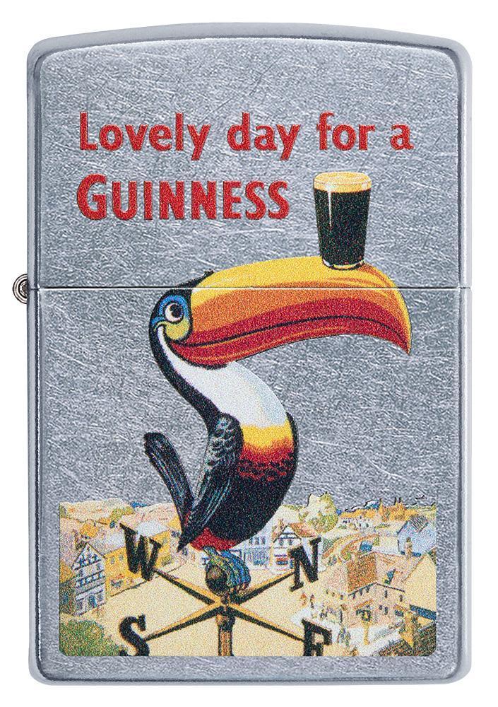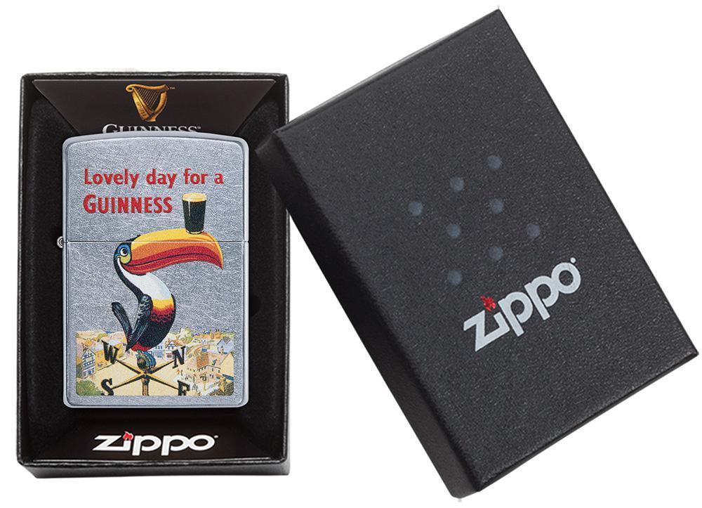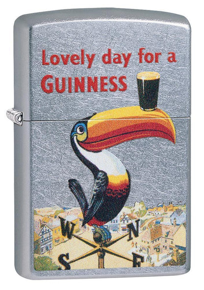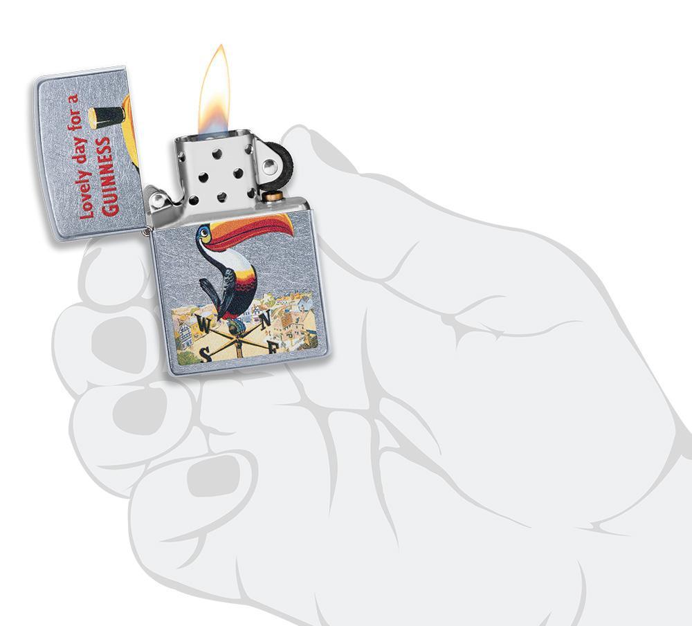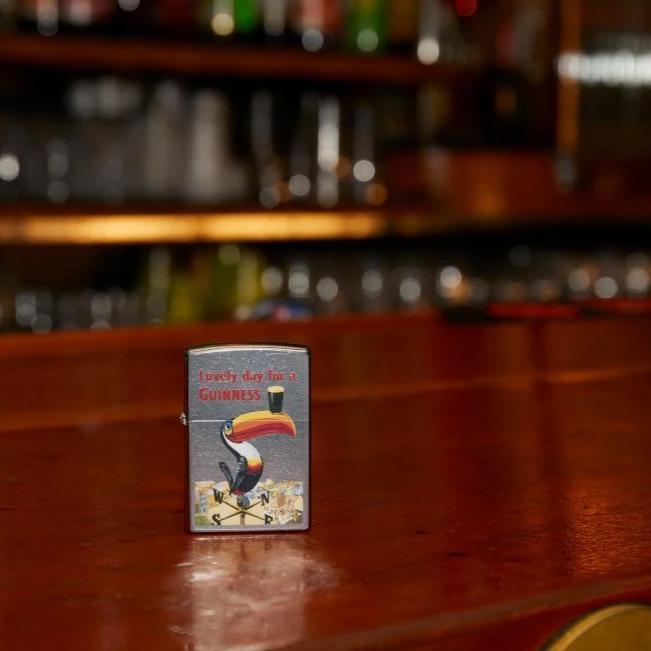 Dublin's famous brewery had been quenching thirsts for more than 175 years when the Guinness® Toucan first made its appearance in 1935. This nostalgic design, colour imaged on a Street Chrome™ lighter, depicts the Toucan balancing the smooth Irish stout on its beak. Bring home a little piece of Irish charm to your pocket today! Comes packaged in Zippo's premium box. For optimal performance, fill with Zippo lighter fuel.