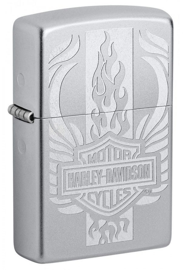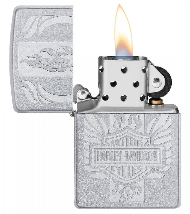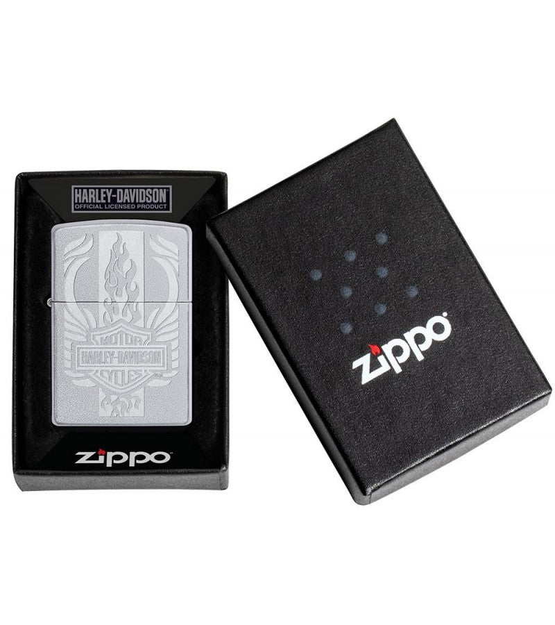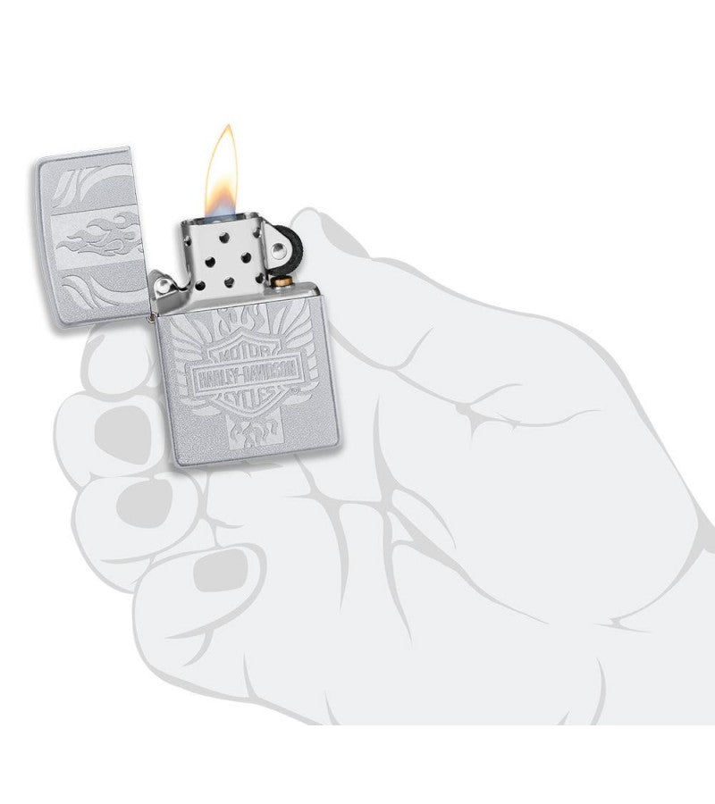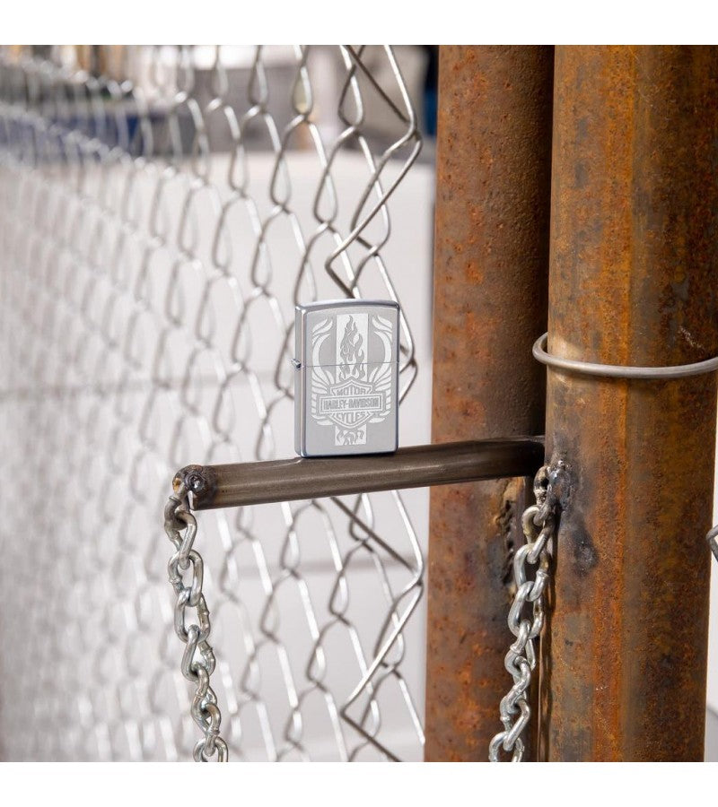 Include Harley-Davidson in your everyday routine with this windproof lighter. The Harley-Davidson bar and shield logo is presented with wings flying out of either side and flames bursting out from the top and bottom of the logo. This design is created using the lustre etch process on a Satin Chrome lighter. Comes packaged in a gift box. For optimal performance, fill with Zippo lighter fuel.