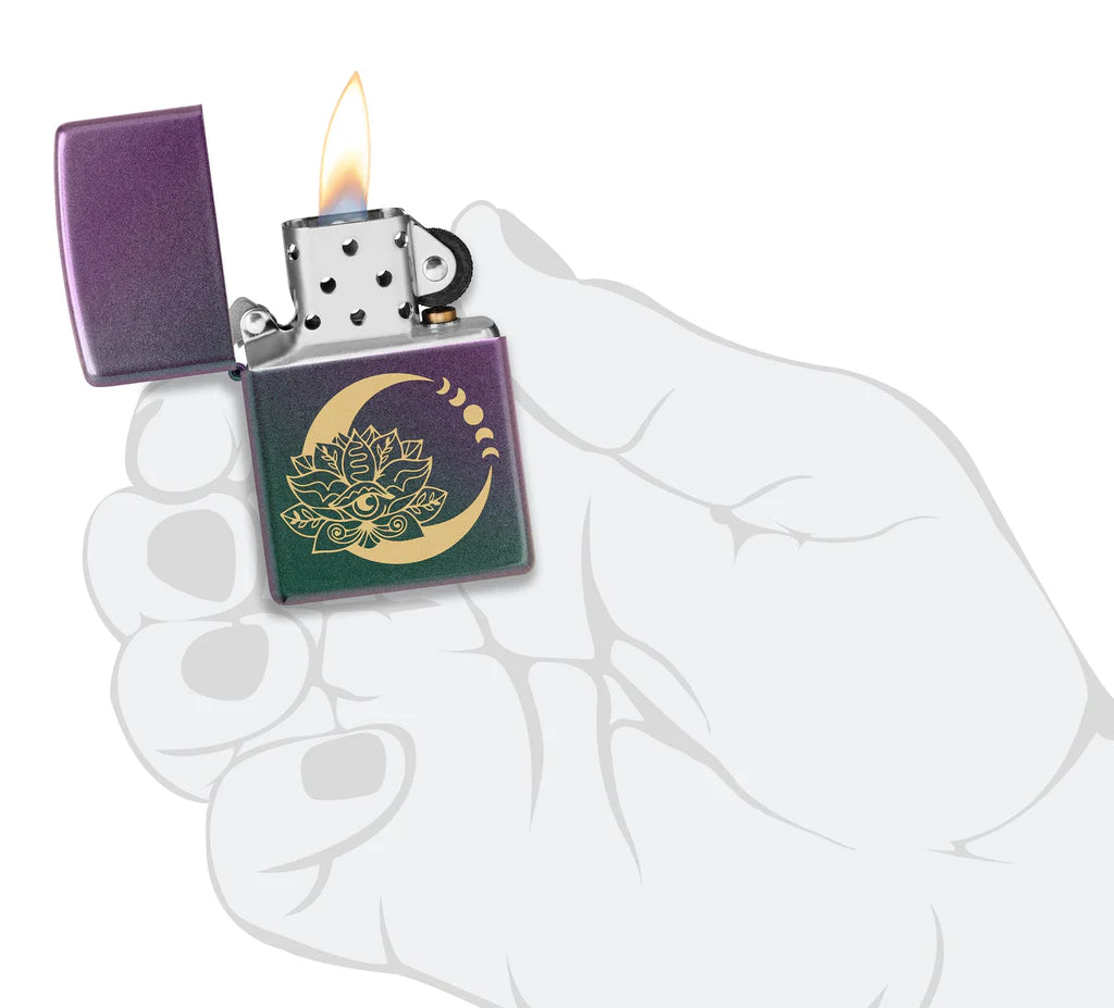 Bring beauty and positivity with you wherever you go with this tranquil Iridescent lighter. Laser engraving reveals the ancient symbols in beautiful brass tones to add luxurious contrast to the shimmering backdrop. Comes packaged in a gift box. For optimal performance, fill with Zippo lighter fuel.