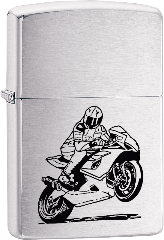 A lighter perfect for the avid Biker. A detailed design featuring a sporty motorbike wheeling across the face of this Windproof Zippo lighter. Comes packaged in a gift box. For optimal performance, fill with Zippo lighter fuel.