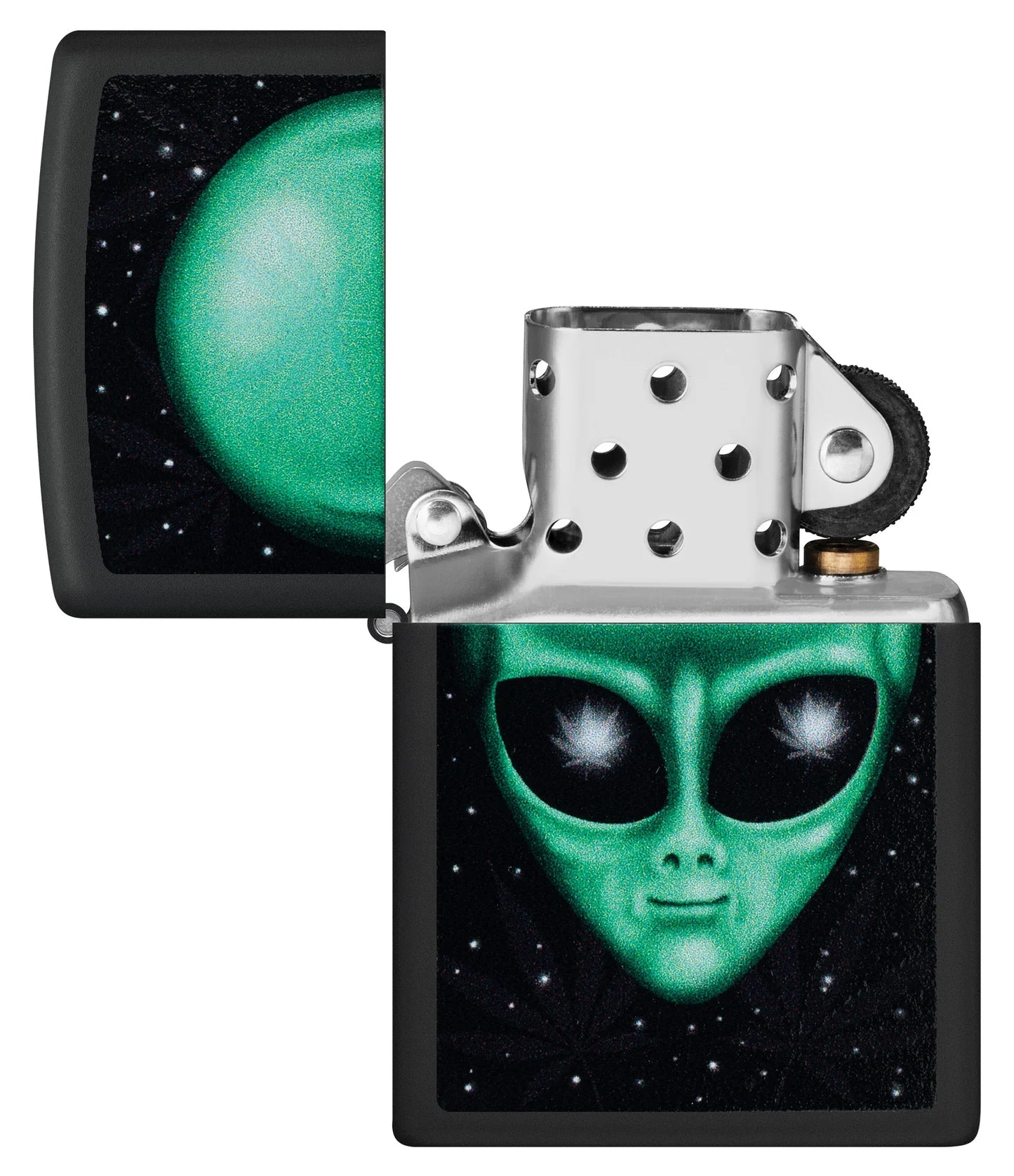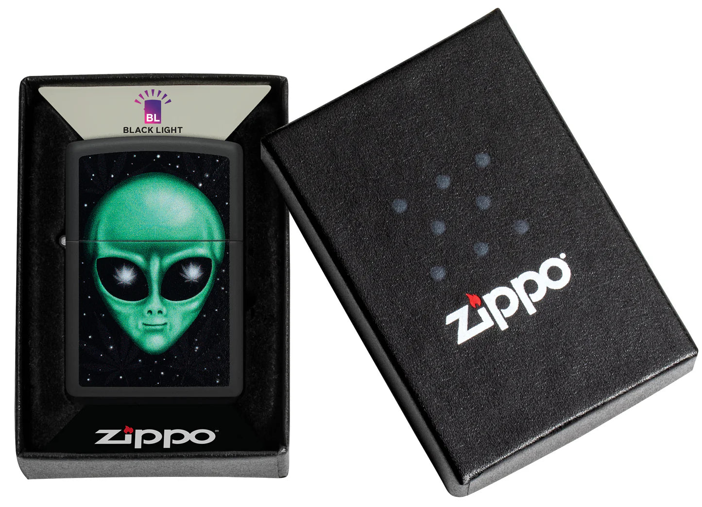 Egy tágra nyílt szemű földönkívüli néz ránk, ennek a klasszikus Black Matte öngyújtónak a felületén, élénk Color Image dizájnnal. Helyezze a mintát ultraibolya fény alá, hogy egy csillogó kannabiszlevelet tárjon fel a speciális Black Light eljárásunknak köszönhetően. Díszdobozba csomagolva érkezik. Az optimális teljesítmény érdekében töltse fel Zippo öngyújtó üzemanyaggal.