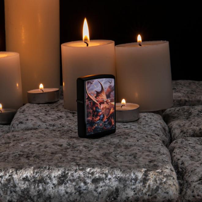 Lépjen be a fantázia birodalmába Anne Stokes bonyolult alkotásaival! Ez a tűzvörös sárkány egy kőhegy tetején nyugszik, és semmi sem állítja meg, hogy megvédje fiókáit. Ezt a fergeteges dizájnt egy fekete matt öngyújtóra festették. Díszdobozba csomagolva érkezik. Az optimális teljesítmény érdekében töltse fel Zippo öngyújtó üzemanyagot .