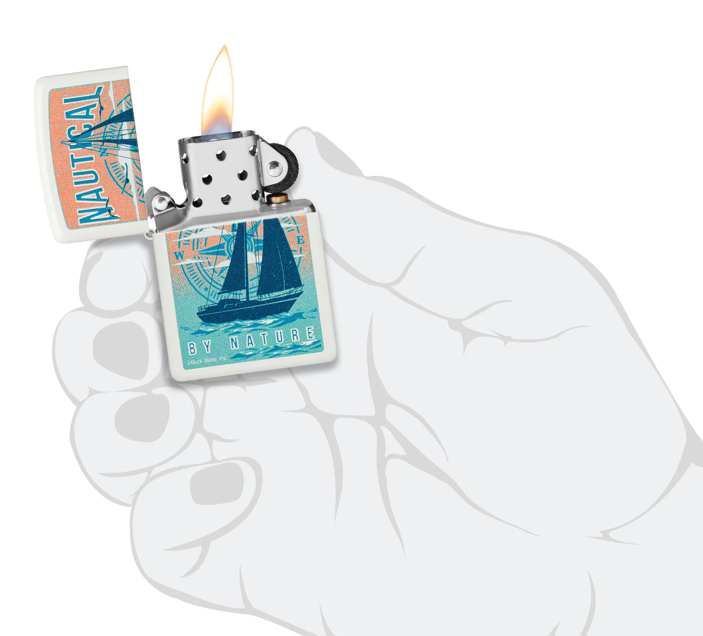 Ismerkedjen meg a Buck Wear™-rel – egy ruházati céggel, amely minden termékében a büszkeséget, a hazaszeretetet és a természet szeretetét ötvözi. Ez a tengerészeti fehér matt öngyújtó nyugodt színes képpel díszített, amelyen egy vitorlás hajó látható a „Nautical by Nature” felirattal. Ajándékdobozban érkezik. Az optimális teljesítmény érdekében Zippo öngyújtó üzemanyaggal kell feltölteni.